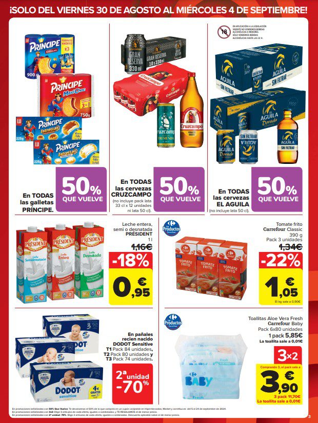 A partir del viernes 30 de agosto y hasta el miércoles 04 de septiembre de 2024, estará vigente el folleto Carreofertas de los hipermercados Carrefour, en el que por tener la App Mi Carrefour, si realizas una compra de 3 Latas de Tinto de verano con limón Ladrón de verano (del 30 de agosto al 01 de septiembre), te devolverán el 100% del importe (acumulable en tu próximo ChequeAhorro), además encontrarás 50 Que Vuelve (en cupón canjeable del 05 al 24 de septiembre), la Segunda unidad al 50% o al 70%, hasta un 48% de descuento y Precios especiales; las ofertas son válidas en productos seleccionados, aplican en sucursales participantes y aquí te dejo el folleto: