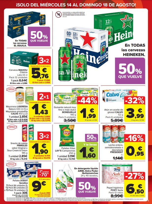 A partir del día miércoles 14 y hasta el domingo 18 de agosto de 2024, estará vigente el folleto de Fin de semana Carreofertas de los hipermercados Carrefour, en el que por tener la App Mi Carrefour, si realizas una compra superior a 50€ en hipermercados (del 16 al 18 de agosto), te llevarás GRATIS 1 Papel de Cocina Renova Design Pack 4 Rollos, además encontrarás un 2×1, 3×2, 50 Que Vuelve (en cupón canjeable del 19 de agosto al 01 de septiembre), la Segunda unidad al 70%, Cupones de hasta 73,35€ para tu próxima compra, hasta un 46% de descuento y Precios especiales; las ofertas son válidas en productos seleccionados, aplican en sucursales participantes y aquí te dejo el folleto:
