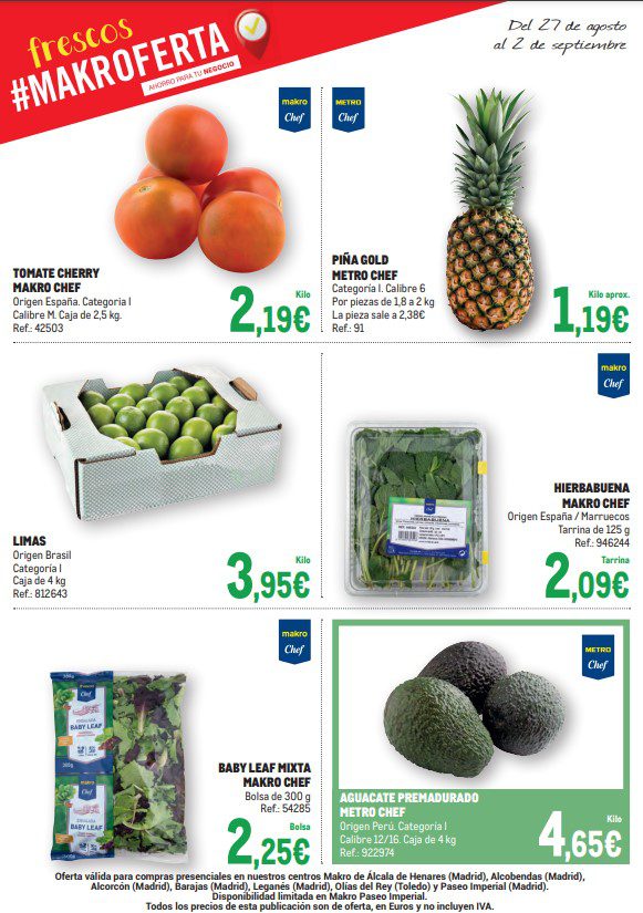 Hace unos minutos me di cuenta que las tiendas de autoservicio Makro publicaron su folleto Makroferta Frescos, que contiene sus ofertas que estarán vigentes del martes 27 de agosto al lunes 02 de septiembre de 2024, en el que encontrarás Precios especiales; las ofertas aplican en artículos seleccionados y son válidas en sus centros Makro de Península y Baleares y en su página de Internet www.makro.es.