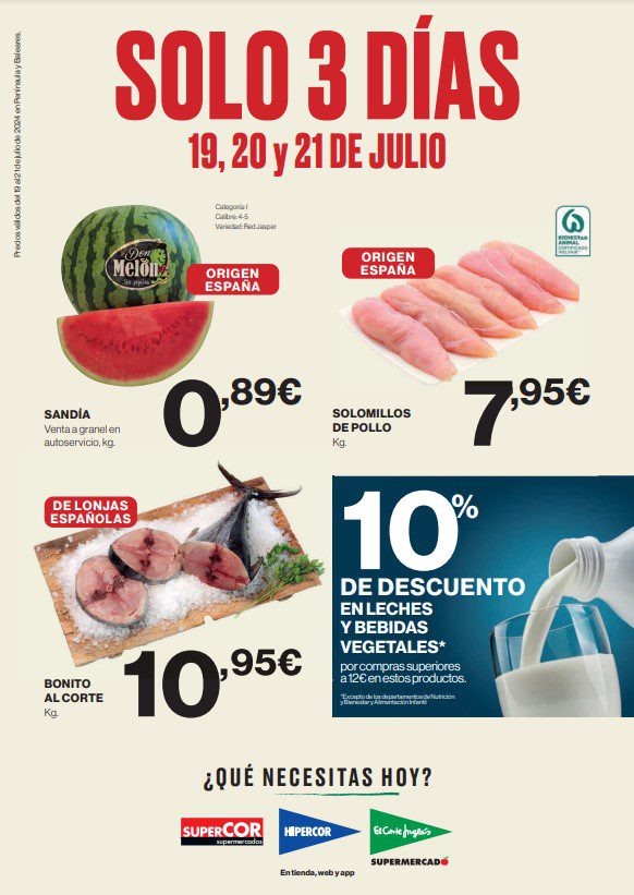 Durante este Fin de Semana (del viernes 19 al domingo 21 de julio de 2024), estará la promoción de Ofertas de los supermercados Supercor, Hipercor y El Corte Inglés, en la que encontrarás Precios especiales en productos participantes; las ofertas son válidas en su tienda en línea elcorteingles.es, en su App (que puedes descargar desde esa misma página) y en sus sucursales físicas. Éstas son algunas de sus ofertas: