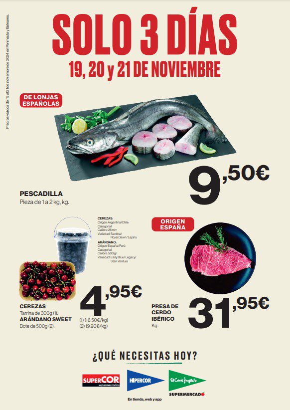 Únicamente por 3 días (del martes 19 al jueves 21 de noviembre de 2024), estará la promoción de Ofertas de los supermercados Supercor, Hipercor y El Corte Inglés, en la que encontrarás Precios especiales en productos participantes; las ofertas son válidas en su tienda en línea elcorteingles.es, en su App (que puedes descargar desde esa misma página) y en sus sucursales físicas. Éstas son algunas de sus ofertas: